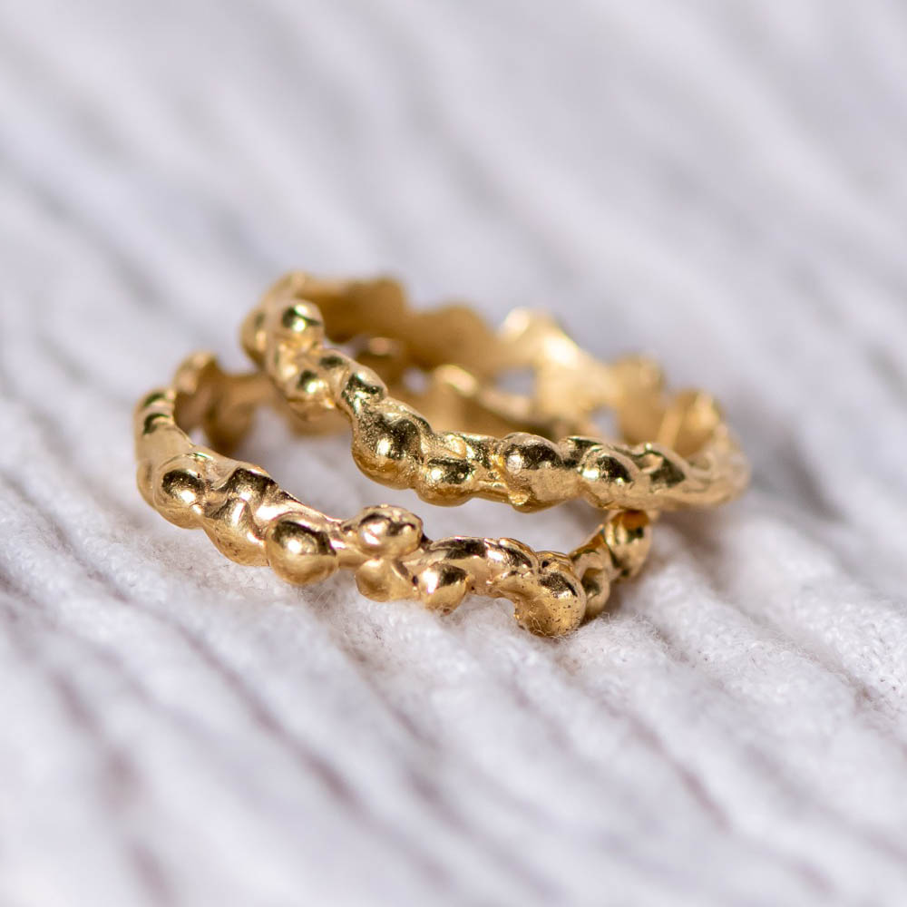 טבעת העשויה בטכניקה של טפטופי שעווה, מה שמקנה לה מראה ייחודי ולא רגיל,